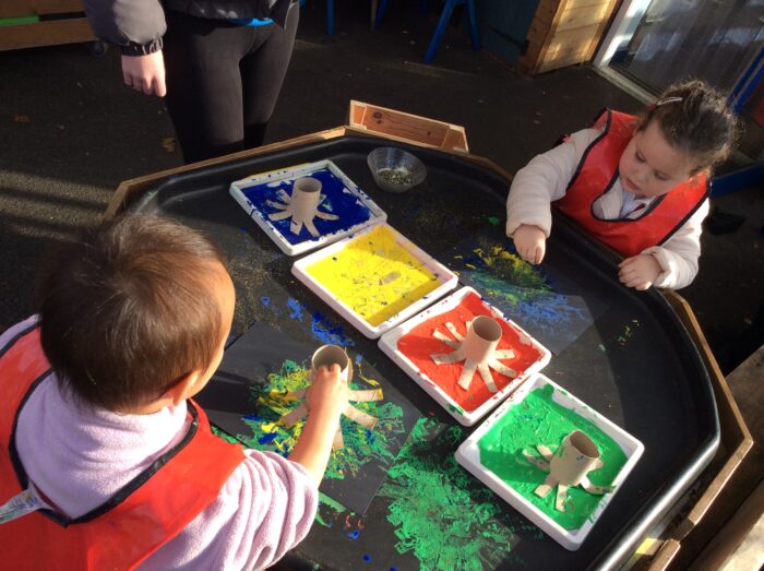 We had Stay, Play and Learn sessions to welcome our parents/carers into our classroom environment and to show them what we have been learning. We used our beautiful autumn foliage and treasures we had gathered whilst we were out exploring on our walk to create an autumn collage. It was a terrific way for our young children to combine art and nature. For the background of our collages, we used a painting technique called – Smoosh painting! (Children blended and mixed colours together with their hands on top of the cling film). It is a wonderful way for children to observe what happens when certain colours blend and it is a lovely sensory experience. The most amazing part was having our parents/carers in the classroom and seeing everyone together!